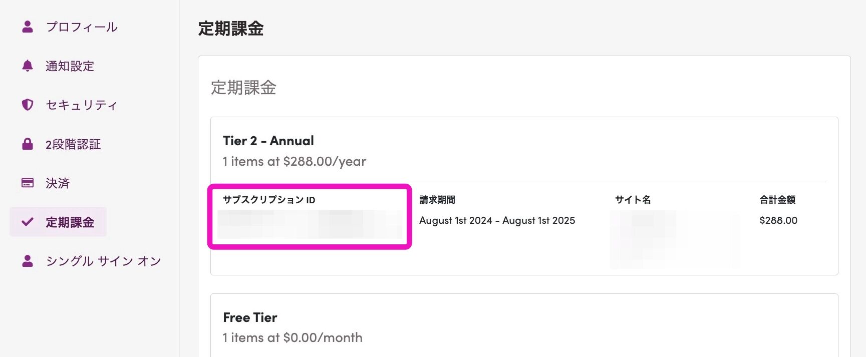 Shifter 公式ドキュメント アカウント関連 サブスクリプションIDの確認方法 サブスクリプションIDの確認方法 サブスクリプションIDは、サイト所有者のアカウントにて、以下の手順でご確認いただけます。 Shifter ダッシュボードへログインするhttps://go.getshifter.io/ 画面右上のアイコンをクリックし、「アカウント」を選択する。 左サイドバーの「定期課金」をクリックする。 ご契約中のサブスクリプションが表示されます。サブスクリプションIDやプラン名などが表示されます。