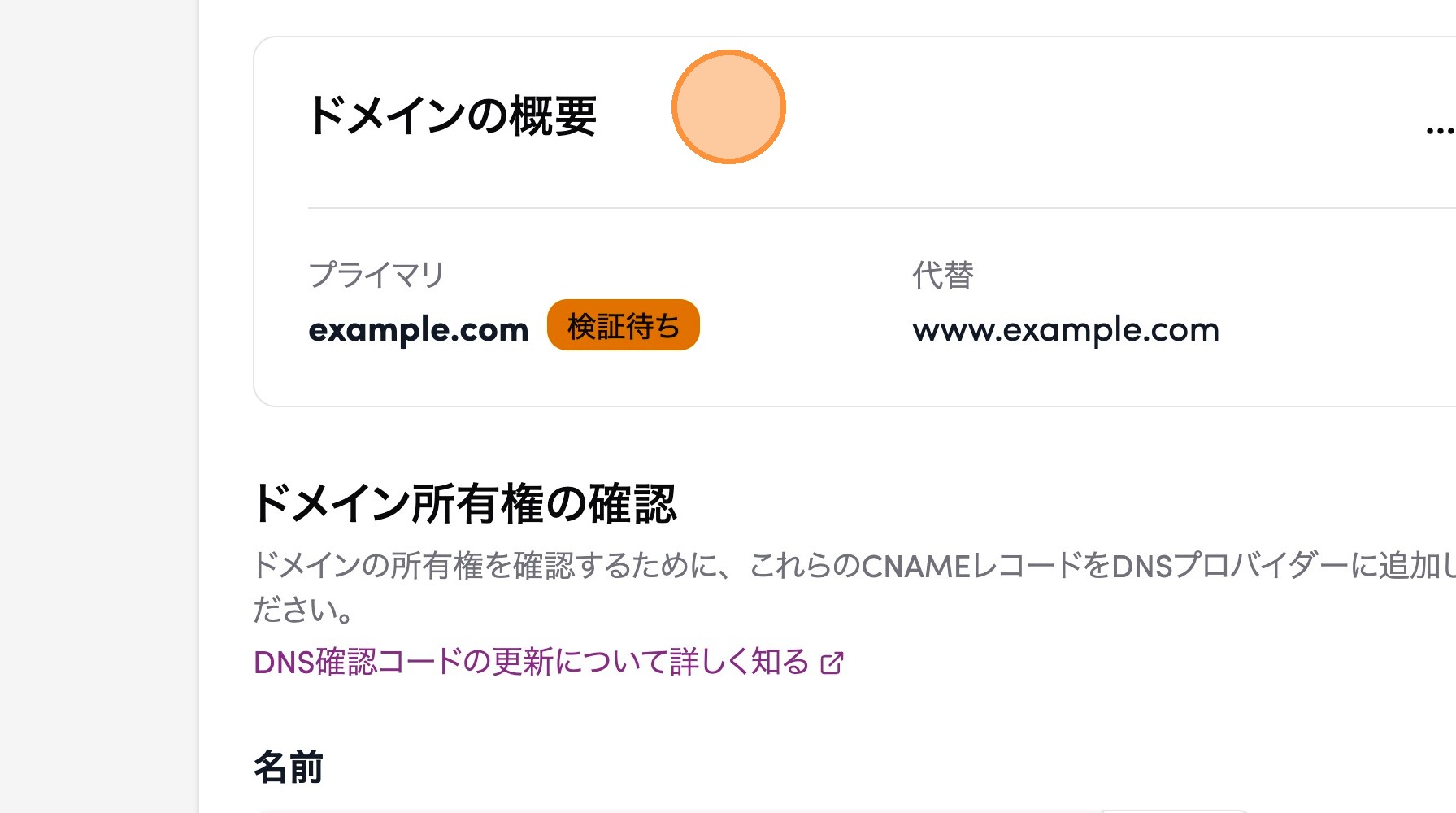 状態は “検証待ち”なのでexample.com とその代替ドメインである www.example.com の両方が登録され、所有確認を待っている状態です。