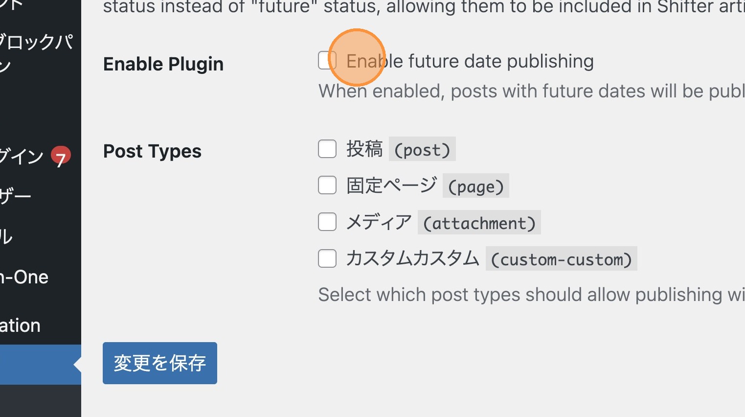 4. “Enable future date publishing”、有効化対象の投稿タイプにチェックを入れて、機能を有効化します