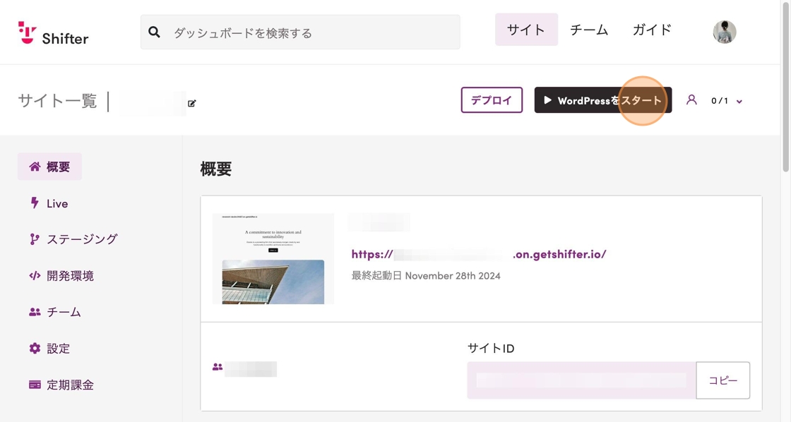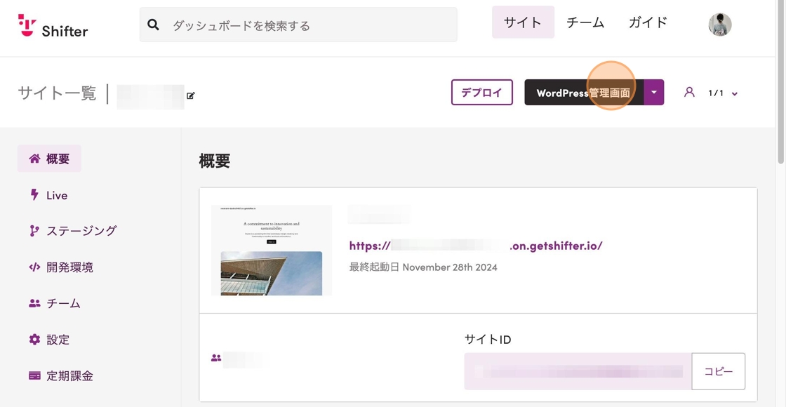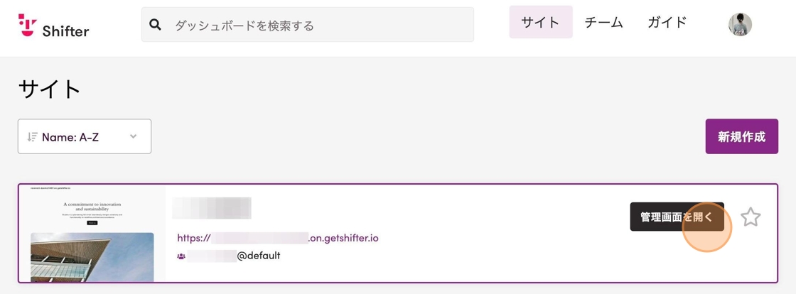 1.  Shifter ダッシュボードへログインしサイト一覧の中から、該当のサイトの「管理画面を開く」をクリックします。