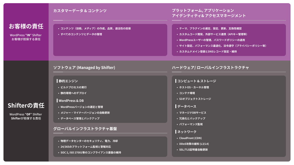責任共有モデルは、クラウドサービスにおいて、サービス提供者と利用者の責任範囲を明確に定義するフレームワークです。Shifter は、AWS(Amazon Web Services)の責任共有モデルの原則を基に、WordPress 静的サイトホスティングサービスに適した二層構造の責任分担を定義しています。